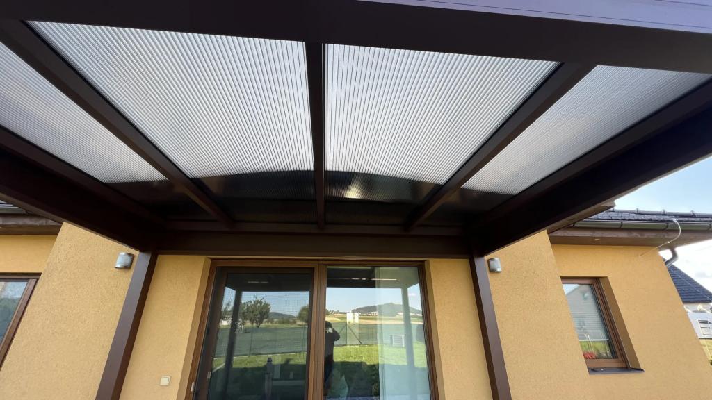 Střecha z pevného polykarbonátu s UV ochranou vyniká vysokou odolností vůči nárazu a dlouhou životností. Zajišťuje vynikající světelnou propustnost, díky které zůstává prostor pod pergolou světlý a vzdušný, a zároveň poskytuje skvělé tepelně izolační vlastnosti.